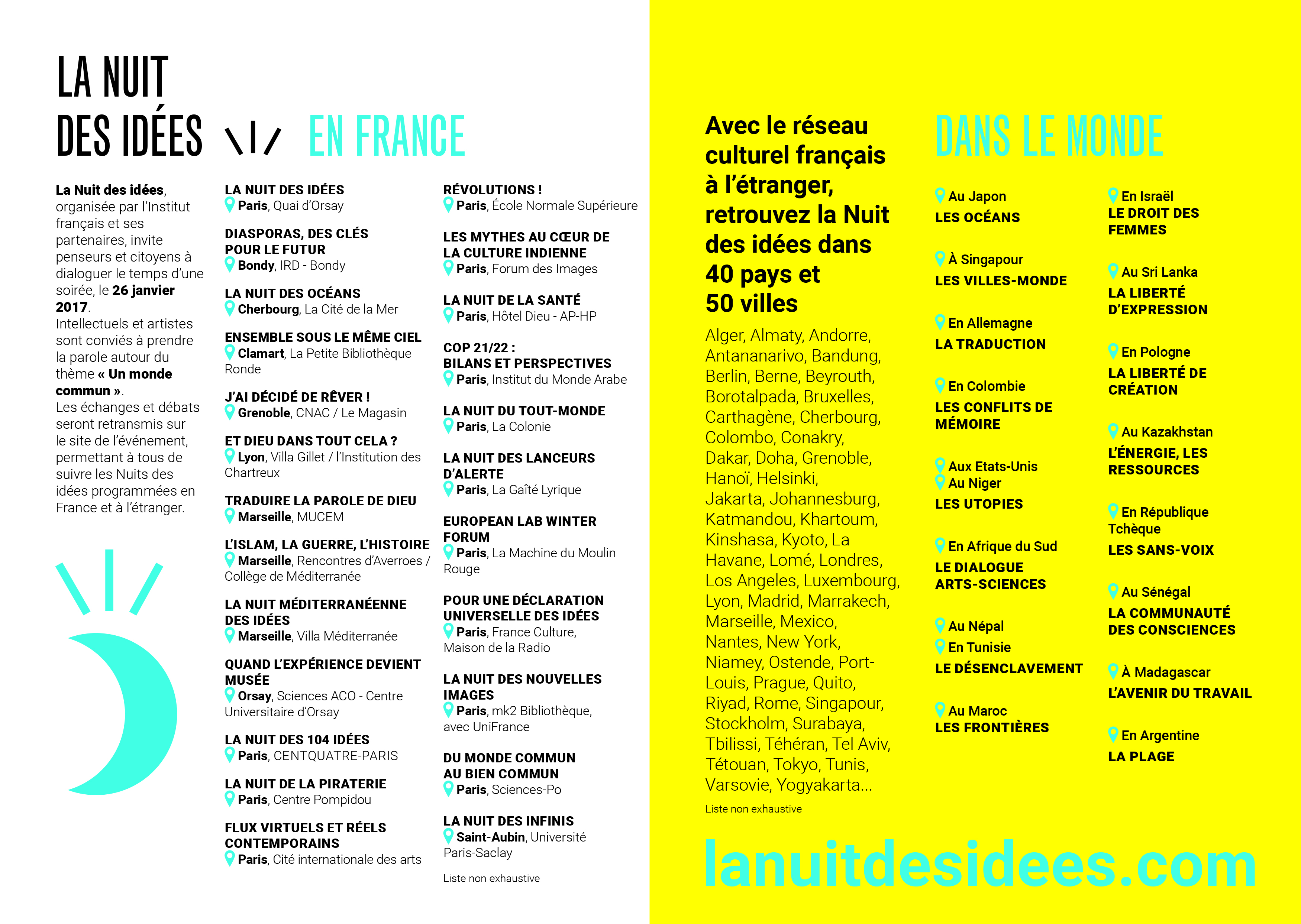 La 2.ª Noche de las Ideas, creada por el Instituto Francés, tendrá lugar este año el 26 de enero próximo, y viajará de nuevo por el mundo entero, desde Singapur hasta Buenos Aires, ya que se van a organizar alrededor de 70 eventos, tanto en Francia como en el extranjero. Investigadores, artistas y creadores se van a reunir para charlar sobre el tema «Un mundo en común». Dentro de este marco, UniFrance en colaboración con el exhibidor mk2, proponen la Noche de las Nuevas Imágenes para discutir sobre el futuro del cine.
