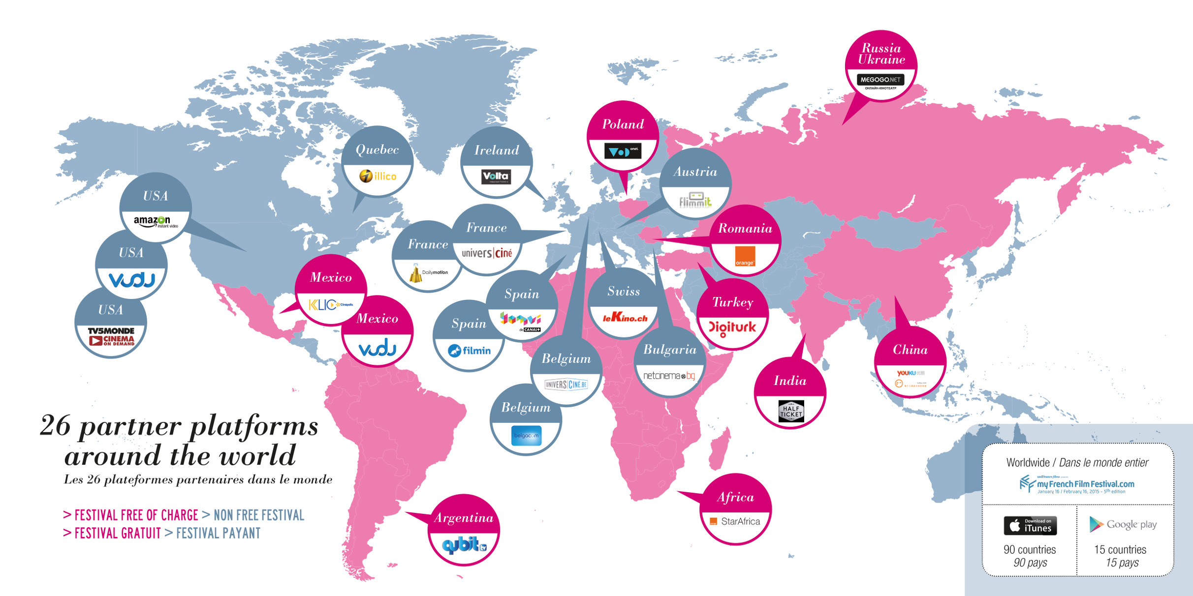 En la plataforma myFrenchFilmFestival.com desde cualquier país. También se puede acceder al festival desde otras treinta plataformas asociadas, en función del territorio del que se trate, entre ellas, desde iTunes en 90 países.