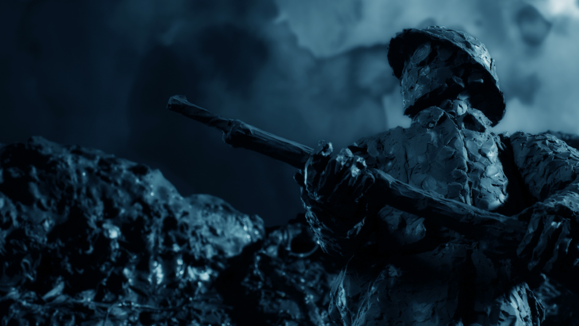 La noche anterior a la ofensiva, un soldado está escondido en el fondo de un túnel. Afuera ruge la guerra como para que tiemble la tierra y el hombre se prepara a lo ineludible. En esta película de animación, los cuerpos de los soldados se vuelven materia, aliación de tierra, fuego y acero, plasmados por la muerte para toda la eternidad.